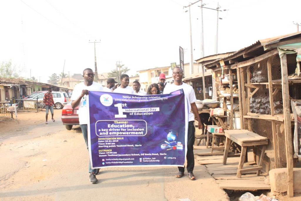 The morning of the 24th day of January, 2019, which marked the 1st United Nations’ International Day of Education, greeted the Taoheed Community, Basin, Ilorin, Kwara State, with an awareness walk. Yattiyr Scholarship Initiative (YSI) began her sensitization with an awareness walk at Taoheed Junction. A cry for “Right to Quality Education” was proclaimed loudly and clearly to all passersby, shop owners, motorists, and the residents in general. A few members of the public along the street were also interviewed to air their opinions on the Nigerian education system.